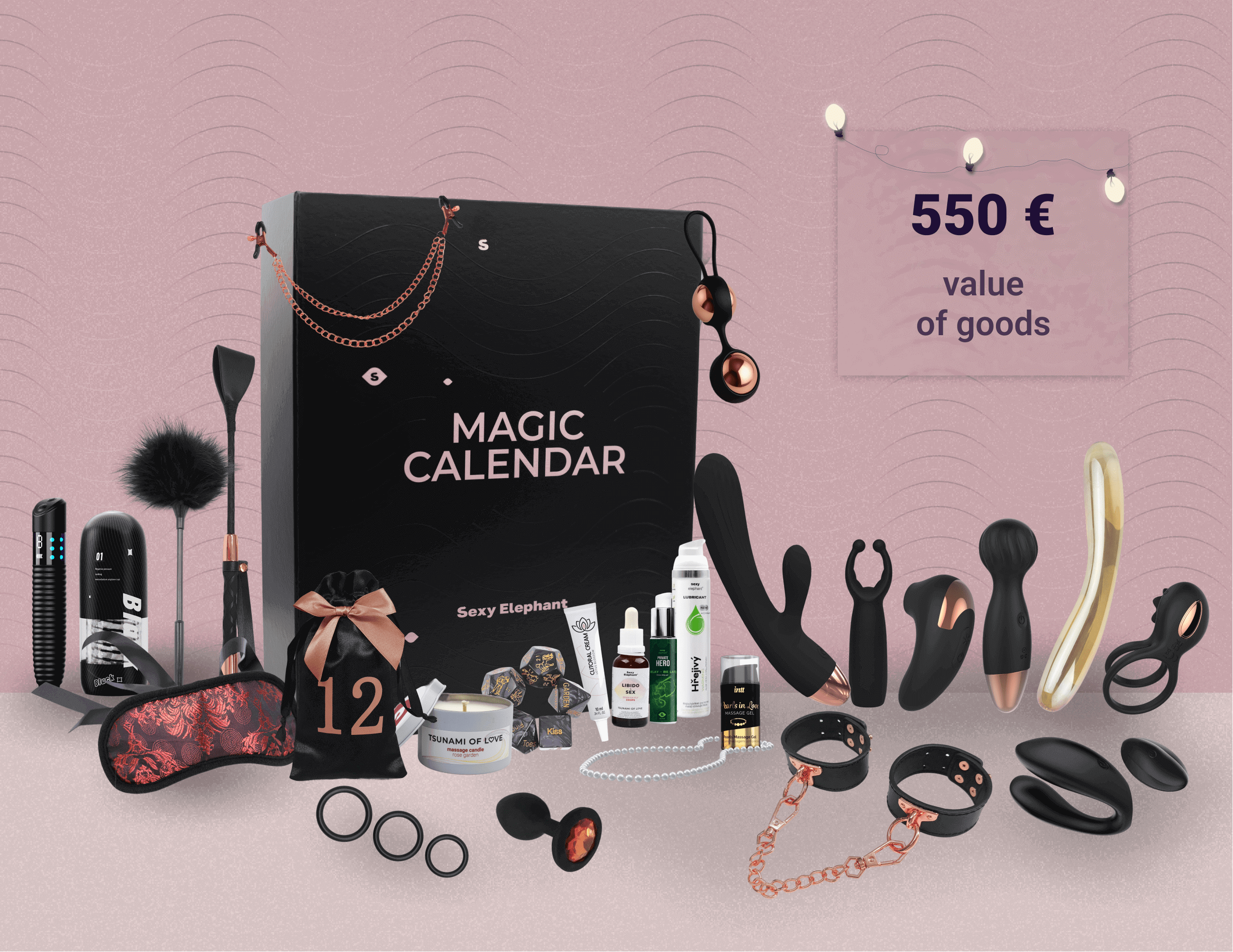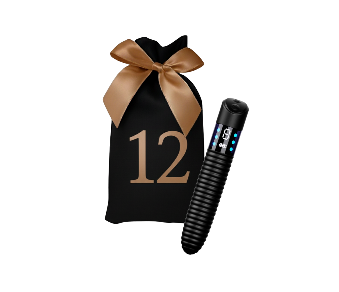 Obdélníkový erotický kalendář v designu knihy působí luxusním a tajemným dojmem. Uvnitř pevné magnetická krabice v černém matu s růžovou termoražbou najdete 24 erotických hraček. Každý produkt je zabalený v černých látkových pytlíčcích se saténovou stuhou v odstínu růžového zlata.