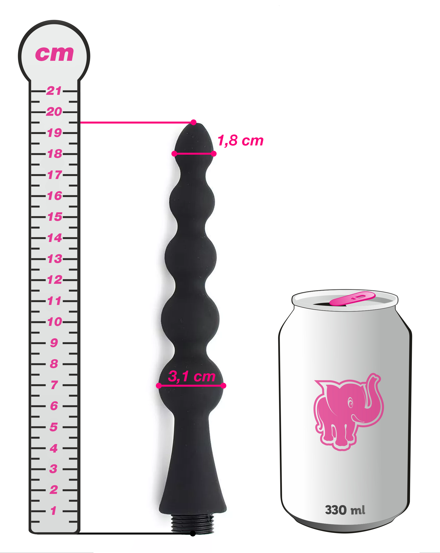 Kvalitní silikonový materiál vás okouzlí svou pružností a sametově hebkým povrchem. Silikon nedráždí kůži a nezpůsobuje alergické reakce, proto se často používá i ve zdravotnictví. Závitem vyrobeným z pevného a odolného kovu anální nástavec spolehlivě připojíte ke sprchové hadici.