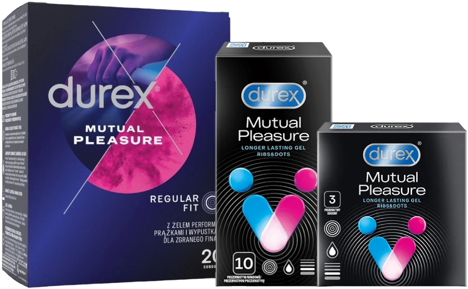 S kondomy Durex Mutual Pleasure si vychutnáte sex déle, než jste zvyklí.Obsahují totiž 5% látku benzokain, která pomáhá oddálit mužskou ejakulaci. Vroubky se postarají o parádní stimulaci a intenzivní dráždění při sexu.