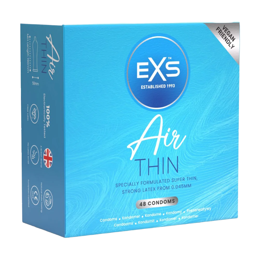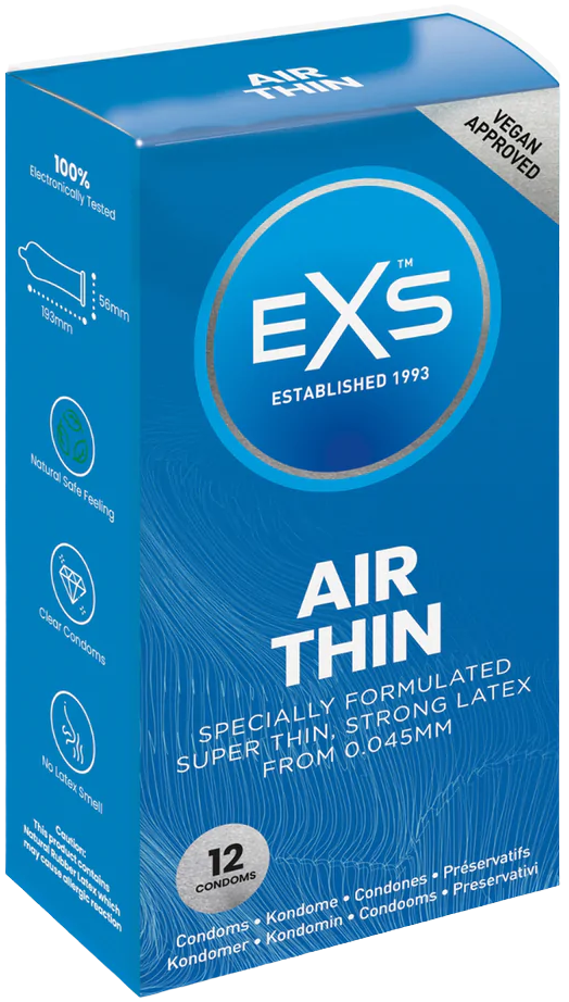 EXS Air Thin kondomy jsou navrženy pro ty, kteří hledají maximální citlivost a přirozený pocit během intimních chvil. Díky extrémně tenké stěně o tloušťce pouhých 0,045 mm poskytují pocit, jako byste žádný kondom neměli, a přitom si zachovávají pevnost a spolehlivost běžných latexových kondomů. Kondomy nemají typický zápach latexu, což zvyšuje komfort při používání. Jsou testovány podle nejpřísnějších evropských standardů a certifikovány Britským institutem standardů (BSI), což zaručuje jejich kvalitu a bezpečnost.