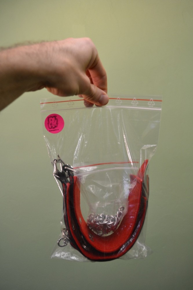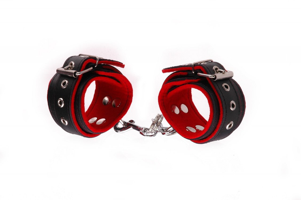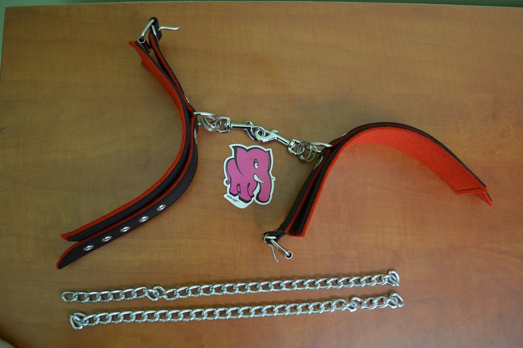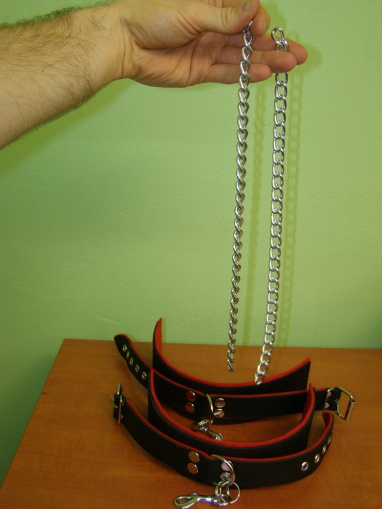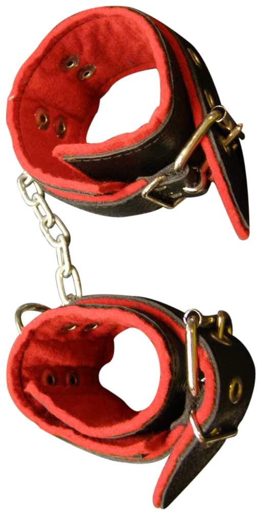 Ručně zpracovaná pouta z kvalitní černé kůže. Podklad z červeného filcu netlačí ani neškrábe pokožku. Kovový řetízek dobře drží, takže pouta vydržela i extrémní zátěžový test, kdy jsme za ně zavěsili člověka. (Pro tyto účely bude ale lepší vyměnit kovové kroužky za trochu pevnější.)