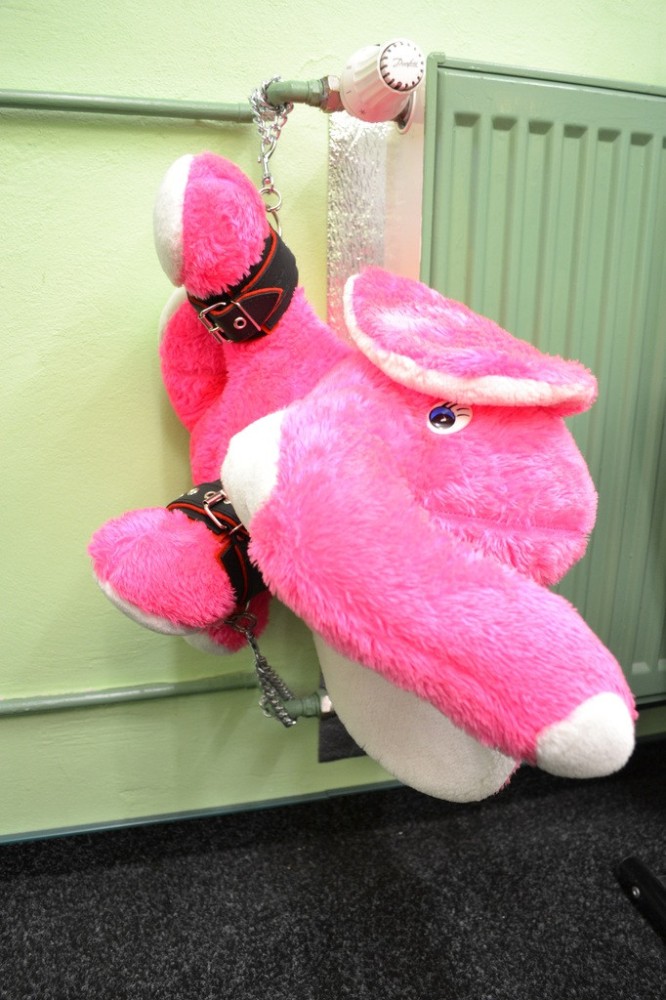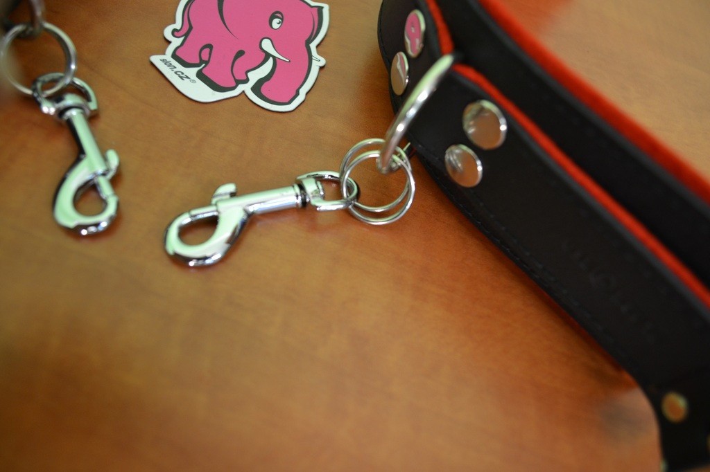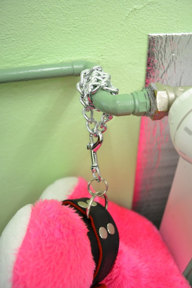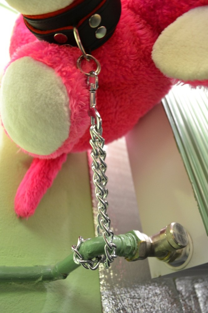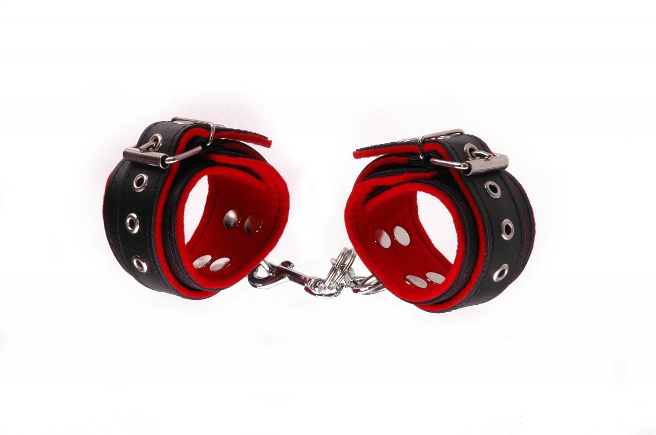 Ručně zpracovaná pouta z kvalitní černé kůže. Podklad z červeného filcu netlačí ani neškrábe pokožku. Kovový řetízek dobře drží, takže pouta vydržela i extrémní zátěžový test, kdy jsme za ně zavěsili člověka. (Pro tyto účely bude ale lepší vyměnit kovové kroužky za trochu pevnější.)