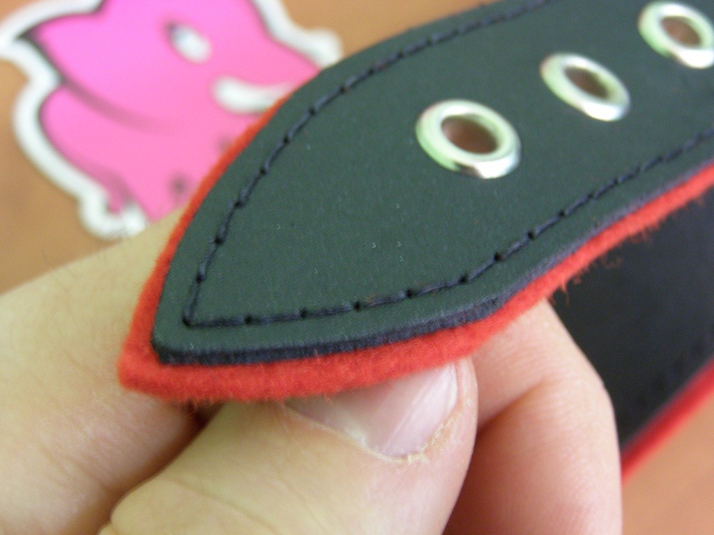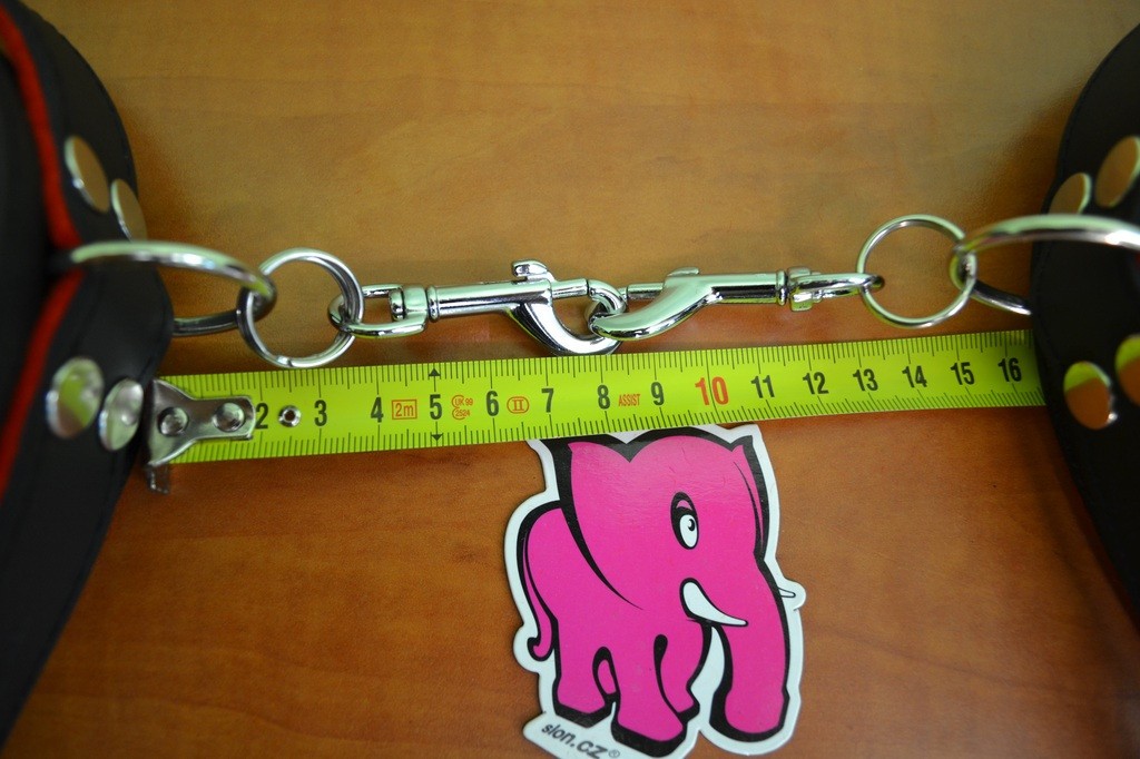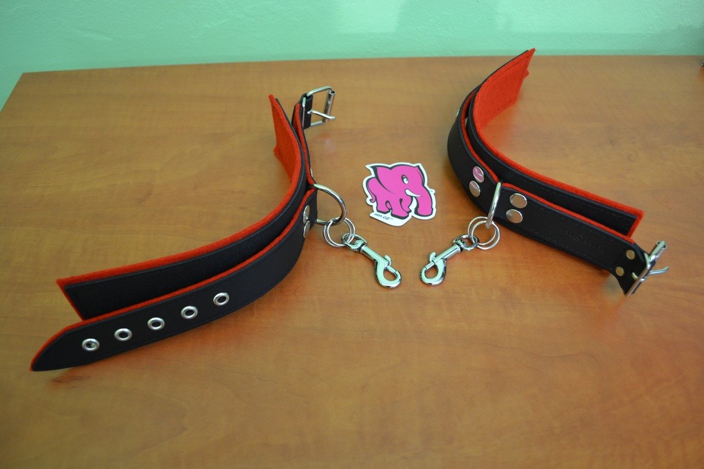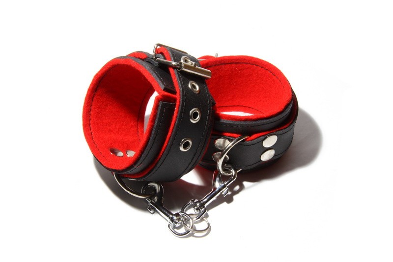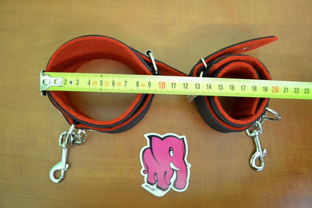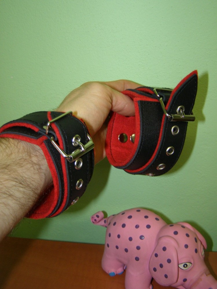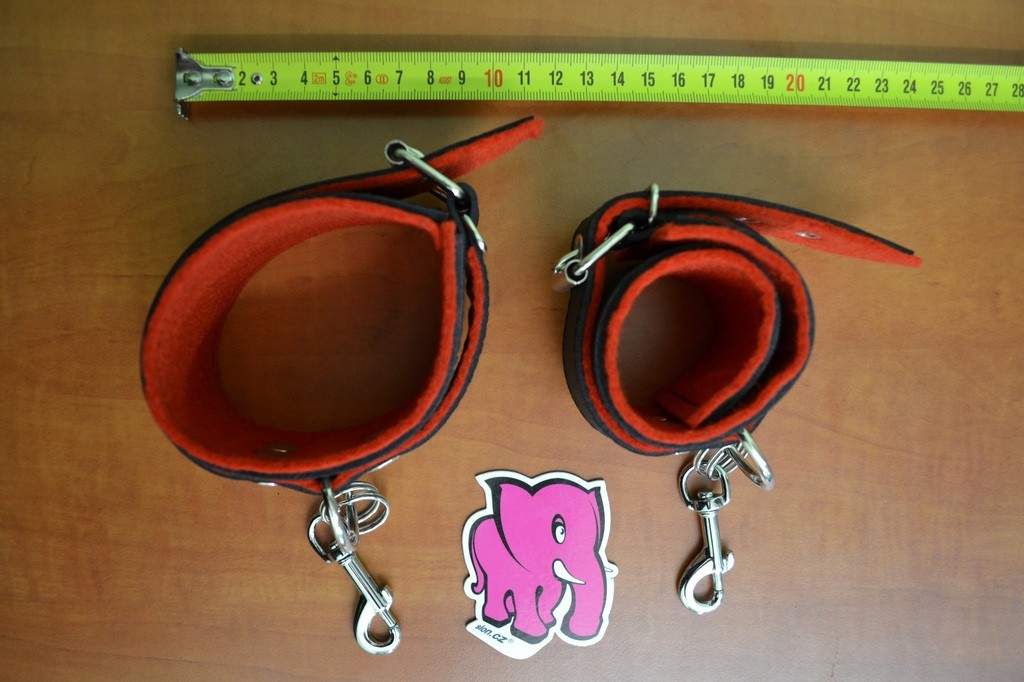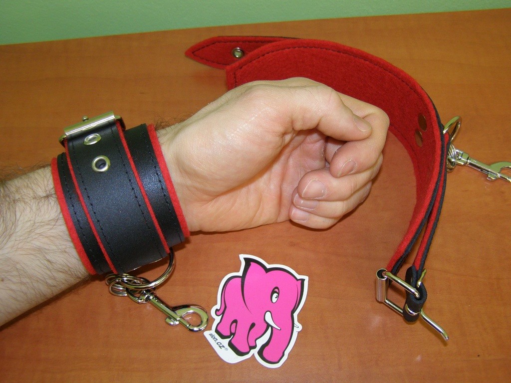 Černo-červená pouta v kvalitním koženém provedení s pevnými karabinami a přezkami. Dobře padnou úzkému ženskému zápěstí, stejně dobře jako těm mužským. Na rukou působí dominantně a efektně. Nikde netlačí a ani při vzpírání se vás nepořežou.