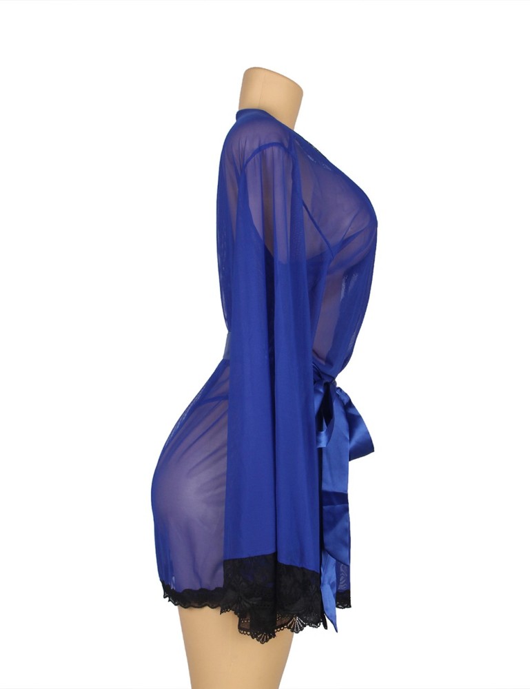 Dámský krajkový župan je vyrobený z elastického síťovaného materiálu, který je na dotek hebký a jemný jako hedvábí. Díky své vysoké pružnosti skvěle padne a lichotivě obepne vaše křivky. Župan zdobí krajkové detaily na dlouhých rukávech, předním dílu a lemu. Je dostupné ve dvou barevných provedeních - černé a modré. Rafinovaný střih s otevřeným předním dílem a dlouhými rukávy ve stylu zvonů dodává modelu na smyslnosti a svůdnosti. Moderní vzhled dotváří hedvábný pásek v pase. Součástí balení jsou i pohodlné tangá z prodyšného materiálu.