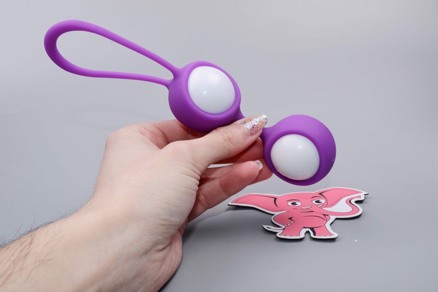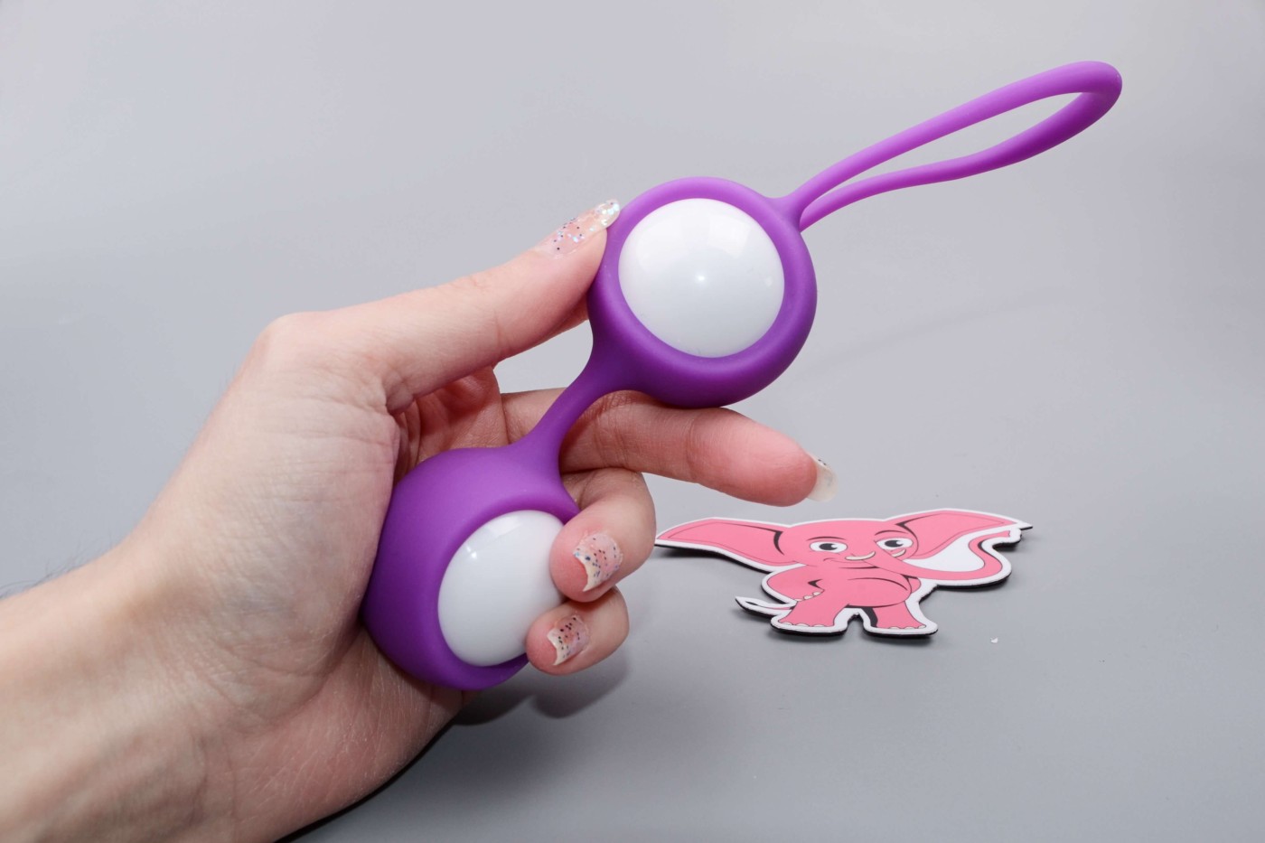 Venušiny kuličky ve fialovo-bílém provedení jsou malé a kulaté. Snadno se proto zavádějí. Díky malým rozměrům se vejdou i do kapsy, ženy je proto můžou mít neustále u sebe. Dlouhé očko nepřekáží v klíně a usnadňuje vytahování pomůcky ven z ženského klína.