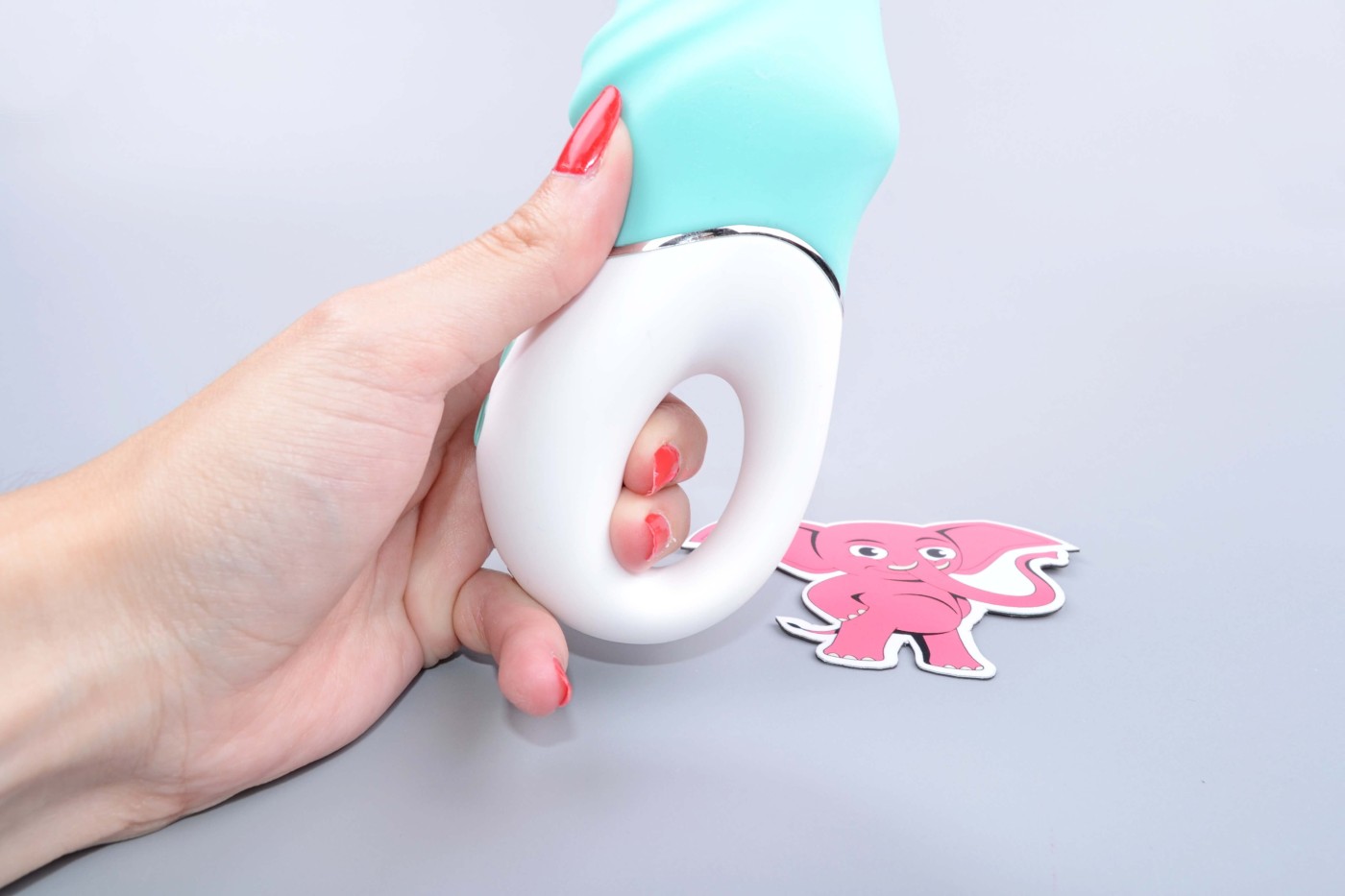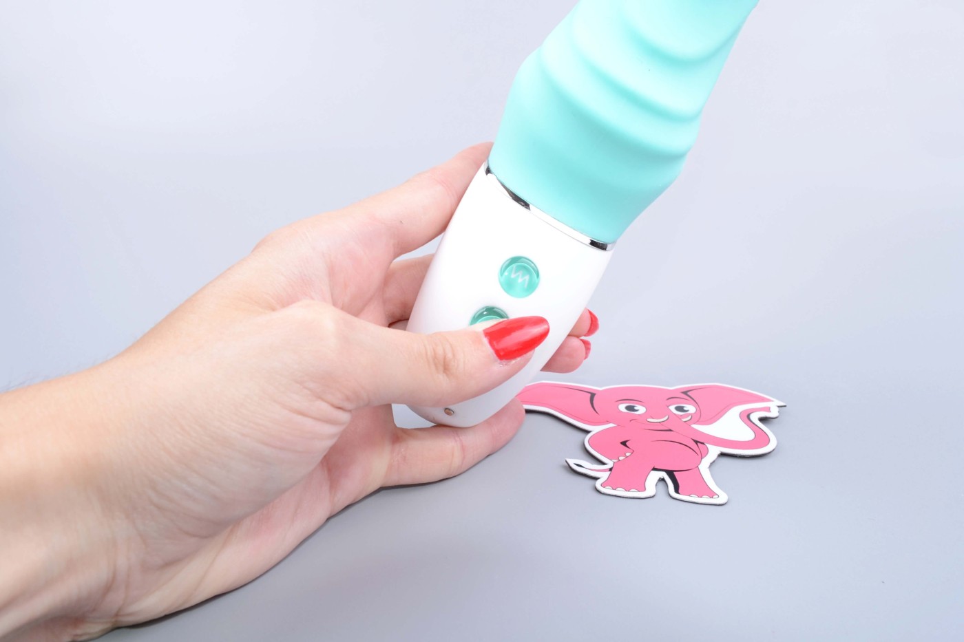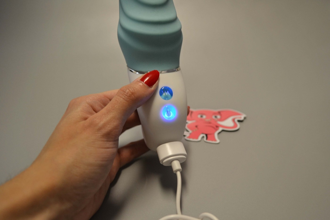 Snadné ovládání pomocí dvou tlačítek zvládnete i s jedním chobotem. Abyste vibrátor zapnuli, musíte dlouhým, cca 2 vteřinovým stiskem zmáčknout spodní tlačítko. Po zapnutí se pod ním rozsvítí dioda, ale vibrovat ještě nezačne. Pro spuštění vibrací musíte krátce stisknout horní tlačítko s vlnovkou. Dalšími krátkými stisky vrchního tlačítka jednoduše měníte vibrační programy. Opětovným dlouhým stiskem spodního tlačítka pak vibrátor zase vypnete.
